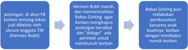 - postingan di akun Facebook milik korban tentang adanya perjudian di Jln. Kapten Bom Ginting yang merupakan miliki Oknum TNI berpangkat Koput Anggota Bataylion 125 SIM Bisa, potingan ini terjadi pada tanggal 22 Juni 2024. Oknum TNI yang dimaksudkan dalam postingan ini adalah milik Herman Bukit. Tentu saja Herman Bukit tidak senang dengan postingan tersebut dan meminta “orang-orangnya” mencari rumah korban alm. Sempurna Pasaribu.