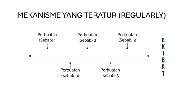 Selain mekanisme sebab yang teratur, ada juga mekanisme sebab yang tidak teratur (irregularly). Mekanisme sebab yang tidak teratur ini, merupakan rangkaian sebab dimana sebab/perbuatan (1) tidak menimbulkan sebab/perbuatan (2), demikian juga sebab/perbuatan (2) tidak menimbulkan sebab/perbuatan pada sebab/perbuatan (3) dan seterusnya. Namun demikian antara sebab/perbuatan (1), (2) dan (3) bisa saling berhubungan dan ketika diakumulasi seluruhnhnya akan menimbulkan akibat (kematian), secara sederhana dapat digambarkan dalam matrik berikut ini: