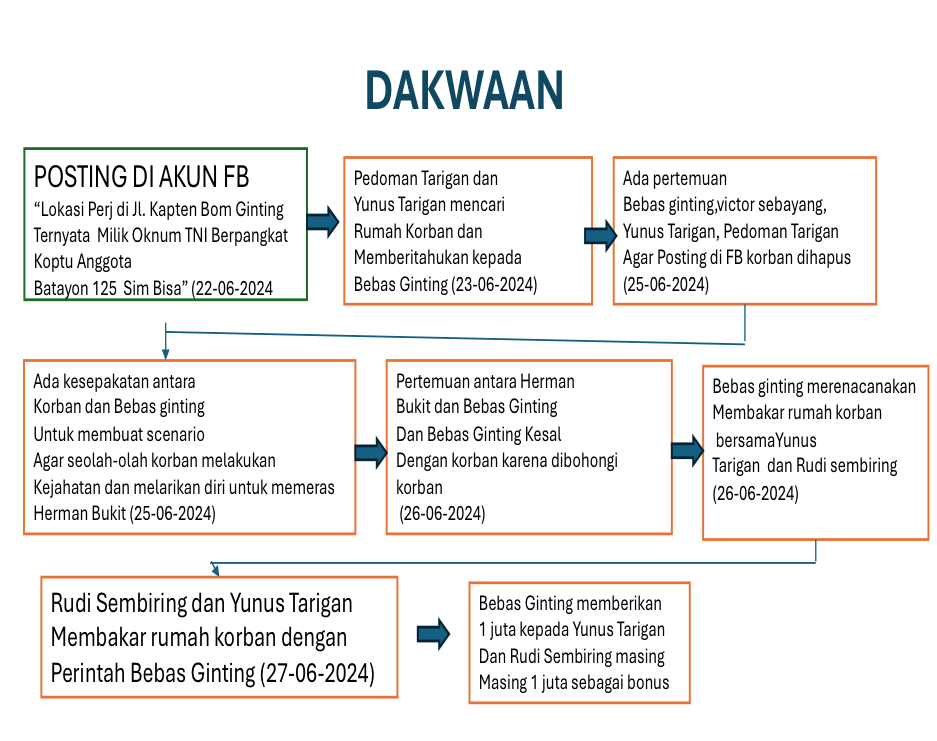 - Pada tanggal 26 Juni, Muncul gagasan ingin membakar rumah korban karena Bebas Ginting merasa sakit hati dengan korban yang merasa dibohongi oleh Korban dan sebelumnya korban telah bertemu dengan Herman Bukit. Terjadi diskusi untuk membakar rumah korban antara Bebas Ginting, Yunus Syah Putera Tarigan dan Pedoman Tarigan.