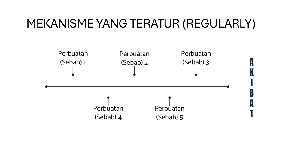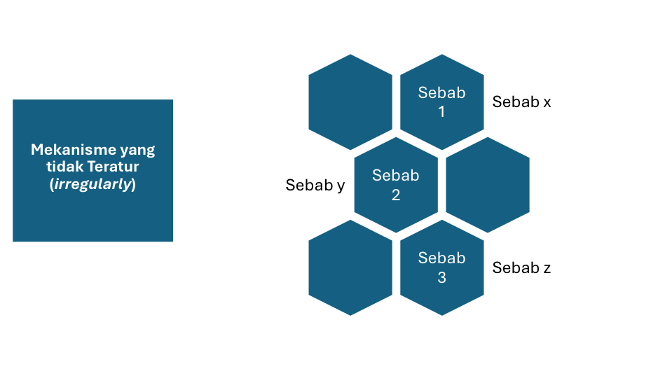 Selain mekanisme sebab yang teratur, ada juga mekanisme sebab yang tidak teratur (irregularly). Mekanisme sebab yang tidak teratur ini, merupakan rangkaian sebab dimana sebab/perbuatan (1) tidak menimbulkan sebab/perbuatan (2), demikian juga sebab/perbuatan (2) tidak menimbulkan sebab/perbuatan pada sebab/perbuatan (3) dan seterusnya. Namun demikian antara sebab/perbuatan (1), (2) dan (3) bisa saling berhubungan dan ketika diakumulasi seluruhnhnya akan menimbulkan akibat (kematian), secara sederhana dapat digambarkan dalam matrik berikut ini: